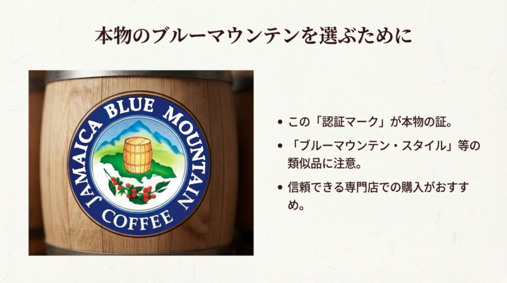 世界的な需要の高まりに伴い、「ブルーマウンテン・スタイル」や「ブルー・ジャマイカン」といった、紛らわしい名称の模倣品やブレンド品が市場に出回ることがあります。本物のブルーマウンテンには、必ずジャマイカ農産品規制公社(JACRA)の認証マークが付与されています。購入の際は、信頼できる専門店を選び、認証の有無や農園名(クレイトンエステート、クライスデールなど)が明記されているかを確認することをおすすめします。