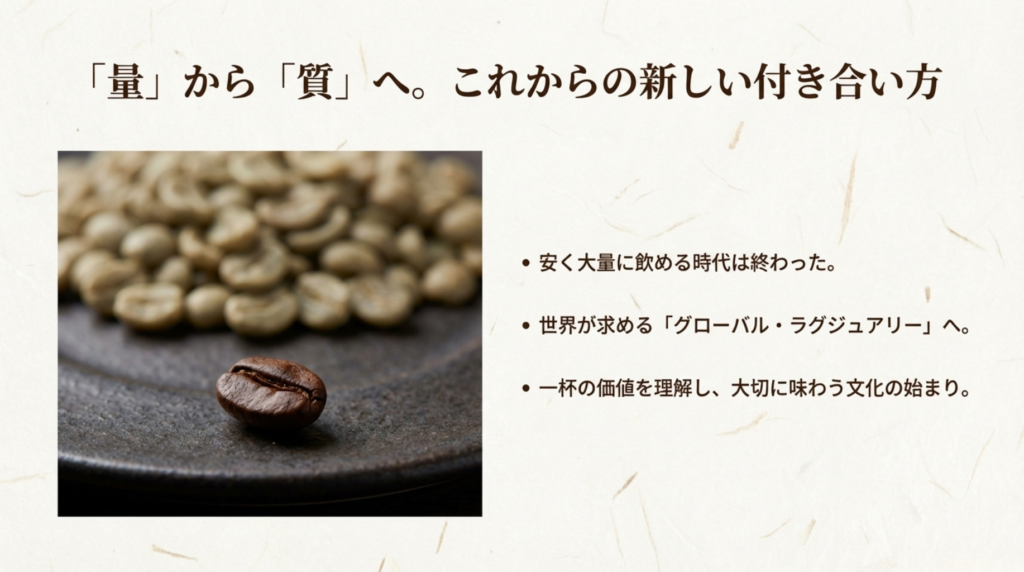 世界中の富裕層が奪い合う「グローバル・ラグジュアリー」になった今だからこそ、私たち日本人は、その希少な一杯をより大切に味わうことができるはずです。ガブガブ飲むコーヒーから、特別な時間を彩るコーヒーへ。成熟した消費国として、ブルーマウンテンの真の価値(テロワールや生産者の努力)を理解し、正当な対価を払って楽しむ。そんな文化が定着すれば、ブルーマウンテンは形を変えて、これからも日本のコーヒー文化の頂点に君臨し続けるでしょう。