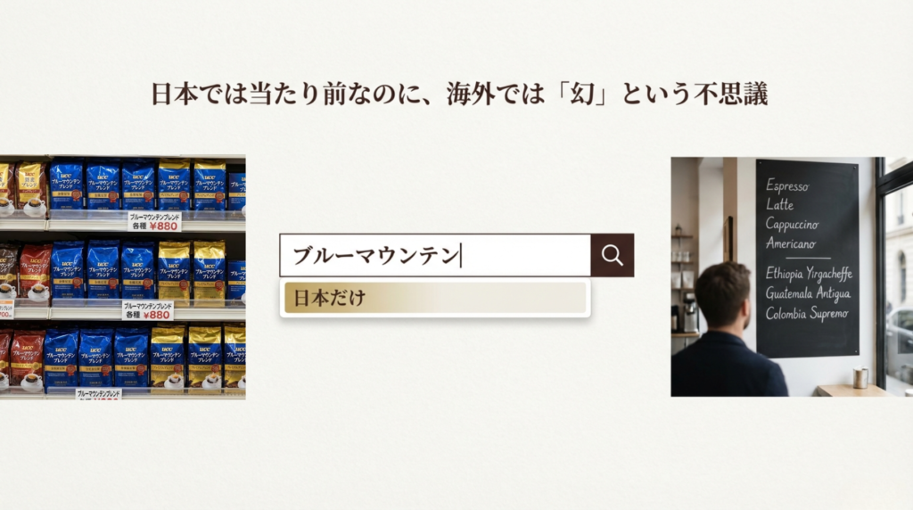 皆さんはコーヒー豆を選ぶとき、「ブルーマウンテン」という名前を見て何を思い浮かべますか?「高級品」「喫茶店のマスターが淹れてくれる特別な一杯」「お歳暮で送るような箱入りのコーヒー」……そんなイメージが強いかもしれませんね。でも、ふと疑問に思ったことはないでしょうか。「どうしてこんなに高級な豆が、日本のスーパーやデパートには当たり前のように並んでいるのに、海外のカフェに行くとほとんど見かけないんだろう?」と。