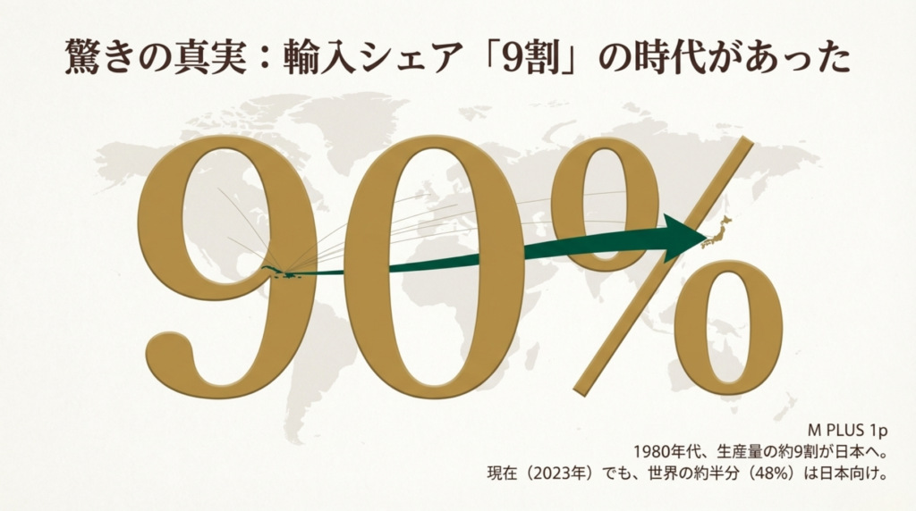 まず、客観的な数字から見ていきましょう。「日本だけ」と言われる最大の根拠は、その圧倒的な輸入シェアにあります。信じられないかもしれませんが、日本のバブル経済期を含む1980年代後半、ジャマイカで生産されるブルーマウンテンコーヒーの約90%が日本向けに輸出されていたという記録が残っています。