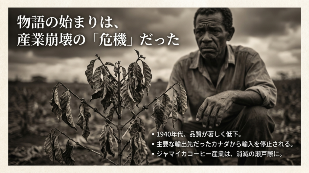 では、なぜ日本はこれほどまでにジャマイカのコーヒーを買い支えることになったのでしょうか。そのきっかけを知るには、時計の針を1940年代まで戻す必要があります。実は、ジャマイカのコーヒー産業は一度、完全に崩壊の危機に瀕していました。