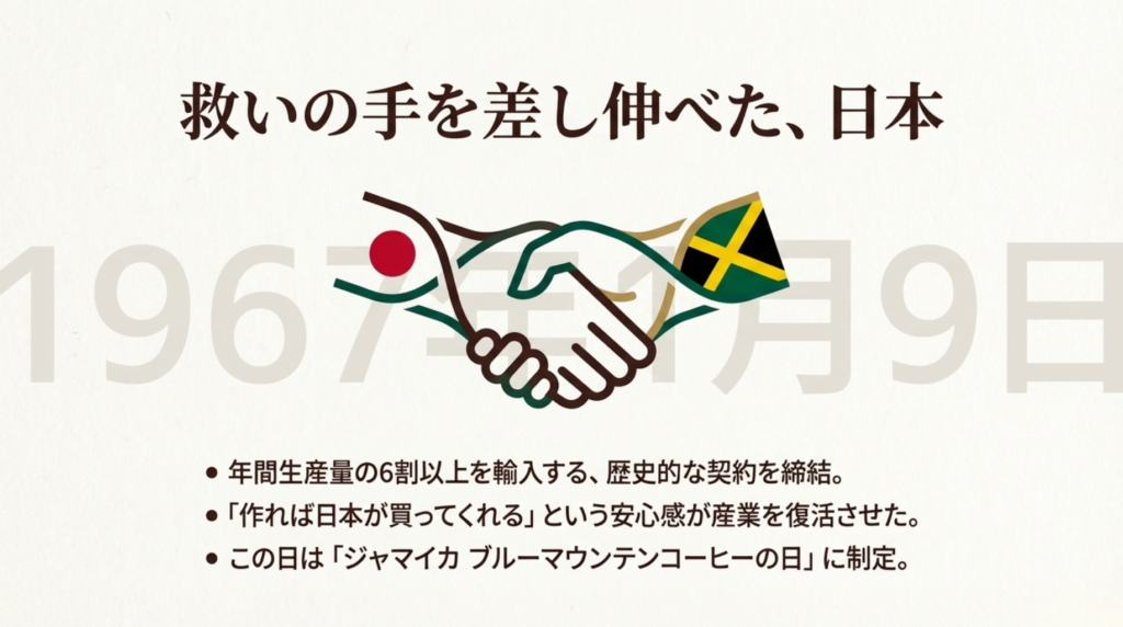 運命の転換点は1967年1月9日。ジャマイカのコーヒー産業の有力者であったキーブル・ムン氏(後の農務大臣)と日本の輸入業者の間で、当時の年間生産量の60%以上に相当する大量のコーヒー豆を日本が輸入するという歴史的な契約が結ばれました。この契約によってジャマイカの生産者は「作れば日本が買ってくれる」という安心感を得て、品質向上に専念できるようになったのです。現在、この1月9日は日本とジャマイカの両国において「ジャマイカ・ブルーマウンテンコーヒーの日」として記念日に制定されています。私たちが美味しいブルーマウンテンを飲めるのは、この時の先人たちの決断があったからこそなんですね。
