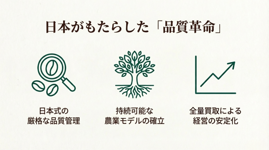 • 品質管理の徹底: 苗木の選定から収穫、精選に至るまで、日本式の厳格な品質基準を持ち込みました。