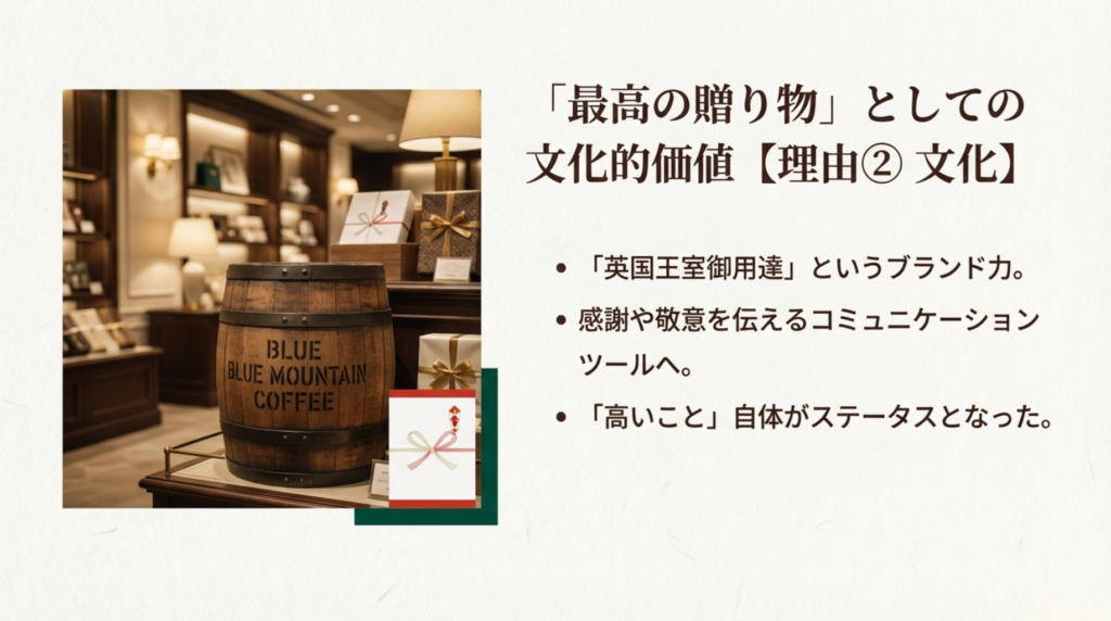 日本でブルーマウンテンがこれほどまでに普及したもう一つの要因は、「ブランド・ストーリー」の力です。日本では特に、贈答品文化と結びついて不動の地位を築きました。