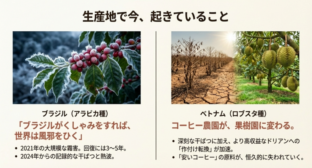 事の発端は、まだ記憶に新しい2021年7月の大規模な「凍霜害(霜)」でした。コーヒーの木は寒さに弱く、霜が降りると葉が焼け、最悪の場合は枯死してしまいます。一度ダメージを受けた木が回復し、再び実をつけるまでには3年から5年という長い月日が必要です。この時の生産能力の低下が、ボディブローのように今も効いているんです。