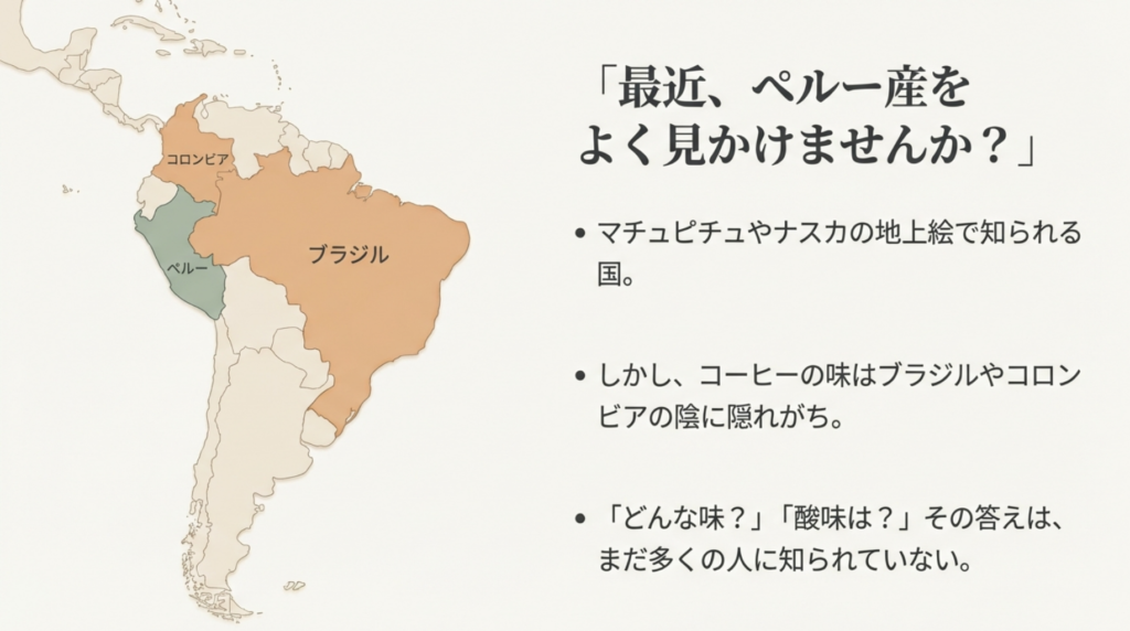 最近、街中のカフェやスーパーのコーヒーコーナーで「ペルー産」の豆を見かける機会が急に増えたような気がしませんか。ペルーと言えば、あの神秘的な空中都市「マチュピチュ遺跡」やナスカの地上絵で有名な南米の国ですが、コーヒーについては「どんな味がするの?」「酸味が強いのは苦手だけど大丈夫かな?」と、詳しく知らないという方もまだまだ多いかもしれません。