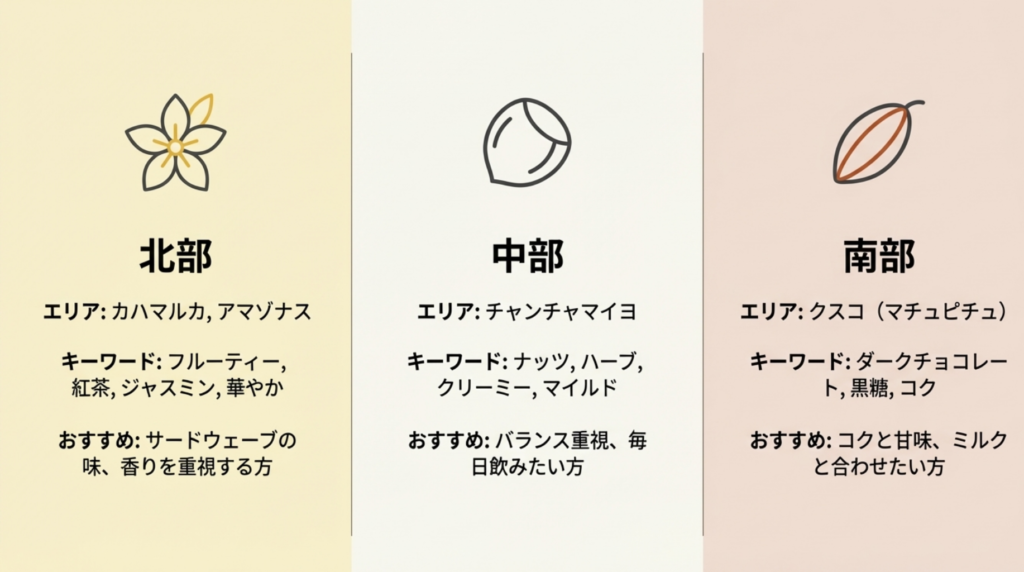 「ペルーコーヒー」と一口に言っても、実は南北に長い国土を持つペルーでは、栽培される地域によって味わい(テロワール)が驚くほど異なります。ここでは代表的な3つのエリアについて解説します。