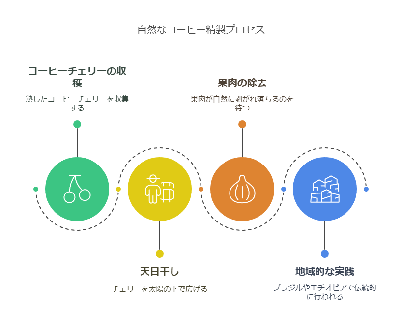ナチュラルは、最も古い精製方法で、エチオピアで生まれたと言われています。 当時は、収穫したコーヒーチェリーを天日で乾燥させ、果肉が自然に剥がれ落ちるまで待つというシンプルな方法でした。現在では、ブラジルやエチオピア、イエメンなど、日照条件の良い地域で伝統的に行われています。