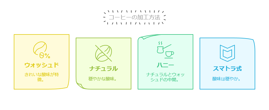 精製方法は、コーヒーの風味に大きな影響を与えます。それぞれの方法によって、酸味、甘味、コク、香りが異なります。
