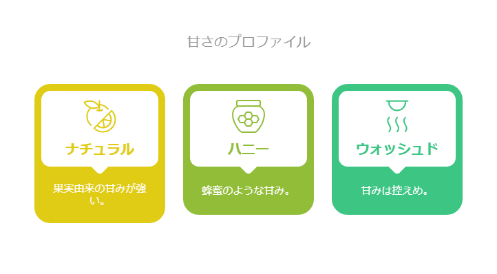ミューシレージ由来の甘みとコクが加わり、ナチュラルよりもクリーンな印象です。 蜂蜜のような甘味を持つものもあります。