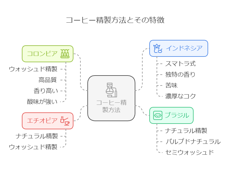 コーヒー豆の生産地と精製方法は密接な関係があります。それぞれの地域は、気候や地形、水資源などの条件に合わせて、最適な精製方法を採用しています。