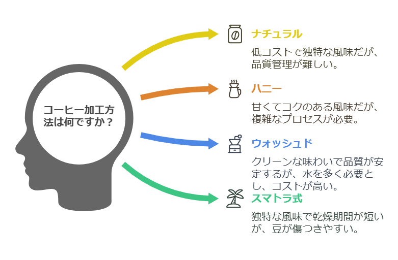 - デメリット:パルプドナチュラルより風味が弱い。ウォッシュドほどクリーンな風味ではない。